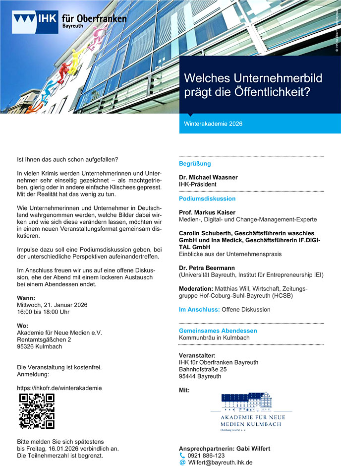 Herzlich willkommen zur Winterakademie der Akademie für Neue Medien gemeinsam mit der IHK für Oberfranken Bayreuth.